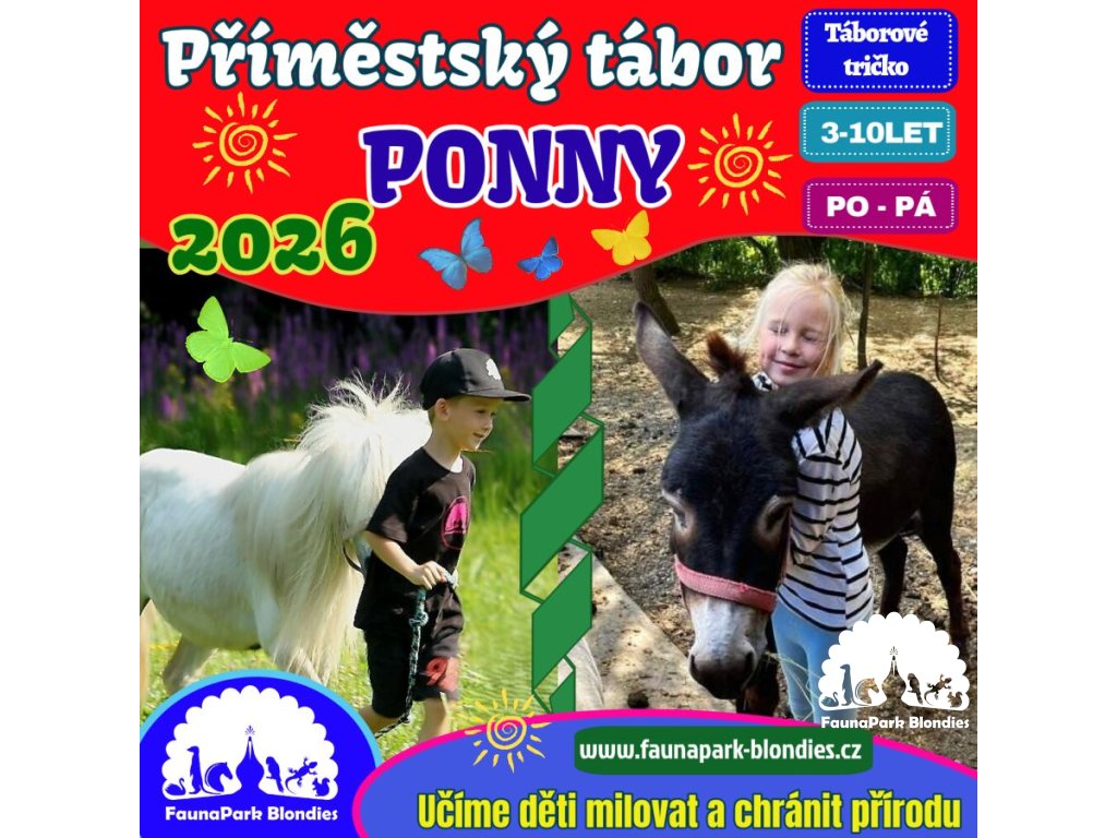 Příměstský tábor u PONÍKŮ ve FaunaParku Blondies Žermanice. Příměstské tábory  pony jsou vhodné pro malé či velké "koňáky", kteří nepotřebují na koních jezdit, ale vyhledávají společnost koní, respektive malých poníčků. Během týdne se seznámí se vším, co ke koním patří. Od základní péče o koně, výběhy, krmení, stlání, ale také samozřejmě čištění, sedlání a kdo bude chtít, tak sveze se také na větších ponících a velkých koních. Vše pod dozorem zkušených instruktorů a licencovaných jezdců. S poníky chodí děti také na procházku, dělají parkur na ruce a další aktivity, které jsou za ta léta kdy tento tábor velmi oblíbené. Naši poníci a oslík jsou hodní a zvyklí na veškerou manipulaci dětmi.